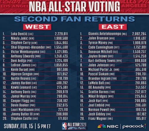 北京时间1月7日公布的2026年NBA全明星球迷投票次轮结果显示,阿夫迪亚得票1224109位列西部第七,力压詹姆斯(1059855)和杜兰特(997386)两位超巨,因此引起了一些争议。