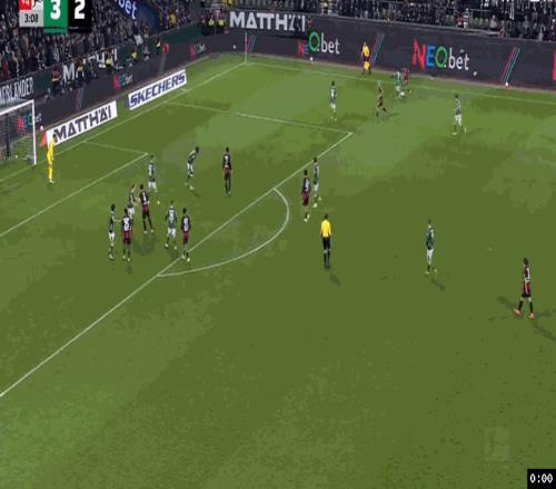 仅仅2分钟后,不莱梅中后场左侧斜长传快速反击,斯赫米德中路跟进突入禁区获得单刀机会,稍微慢半拍的情况下,面对出击的门将考阿,斯赫米德转身往右边做球,后排插上的米洛舍维奇迎球推射空门得手,不莱梅3:2反超了比分。从两度领先到落后,法兰克福没有放弃,补时最后1分钟,法兰克福右路压上,埃奇古亚卜强行突破下底,抢在皮球出底线之前将球兜回来,克瑙夫小禁区前沿抢点凌空推射,皮球直入球门右下死角,法兰克福3:3压哨绝平不莱梅。