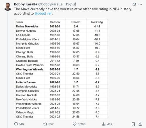 北京时间11月7日,独行侠记者Bobby Karalla晒出一组数据对比:本赛季的独行侠,拥有NBA历史最差的相对进攻效率值(-11.8)。此前最差纪录是2002-03赛季的掘金(-11.4),那个赛季的掘金仅取得17胜65负,西部倒数第一。